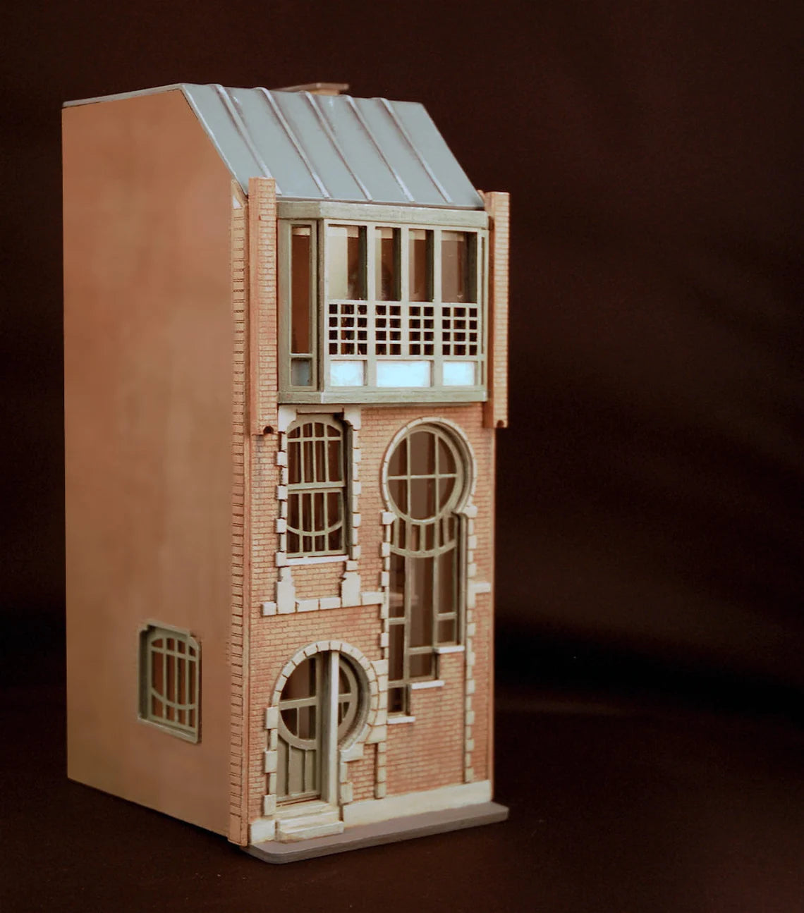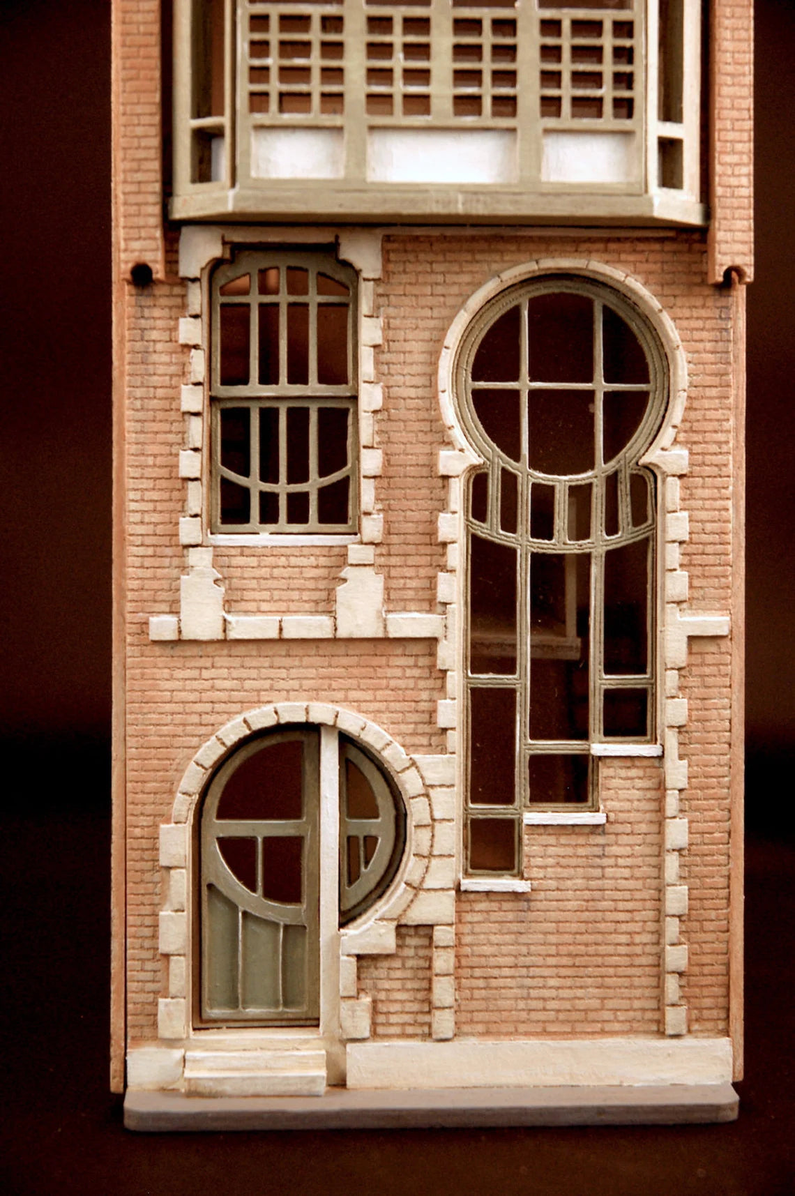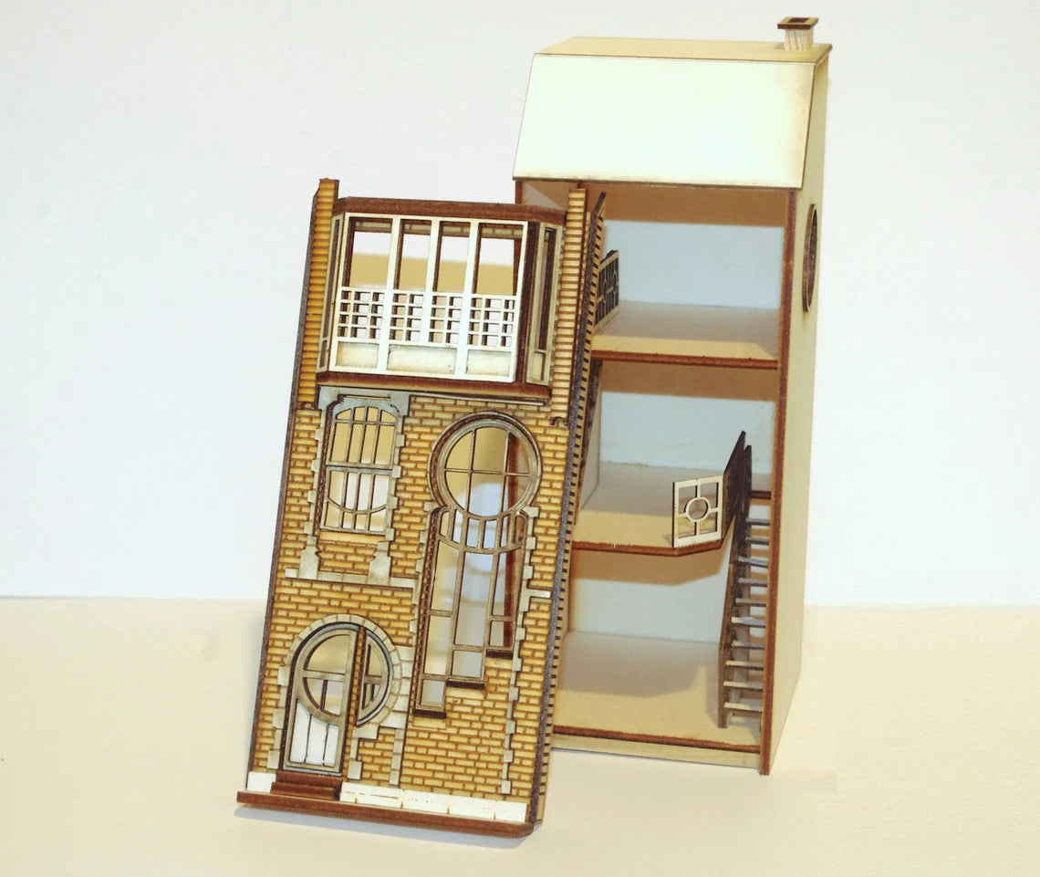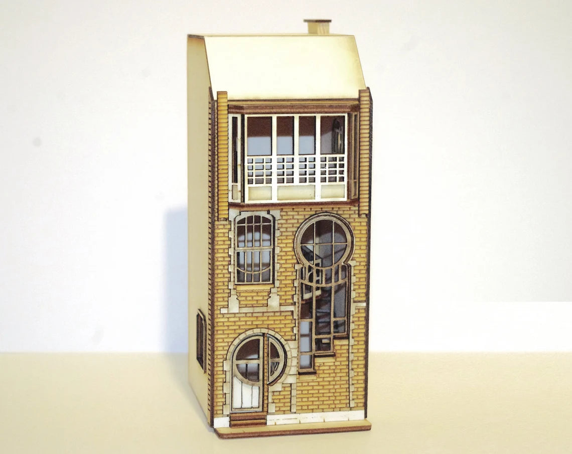 This is a laser-cut wooden kit 'Lunar House' - a mid 1920’s townhouse featuring an architectural design based on the later European Art Nouveau art movement. This townhouse building has striking features with its circular windows.