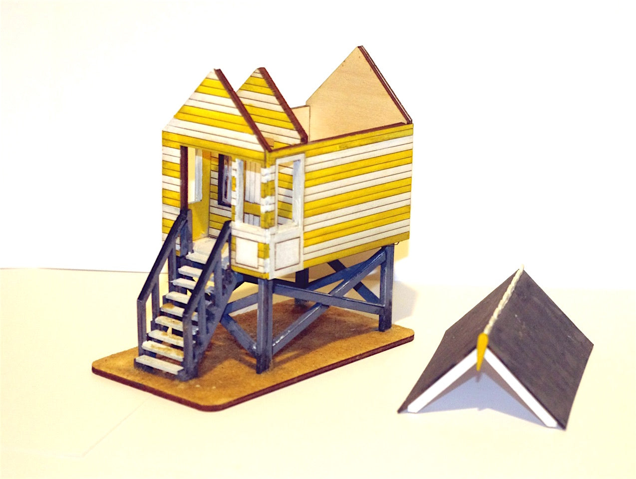 This is a laser-cut wooden kit model of a typically British tranquil seaside beach hut. 'Gull' consists of 1 room and a covered deck. The building's roof is removable for access to the internal space. The kit comes complete with all structural elements to create walls, roof and steps and is accompanied by documentation covering a recommended approach to construction. The Gull beach hut sits at 5" D x 3" W x 5.25" H (12.5 Dx 7.25 W x 13 H in cms.)