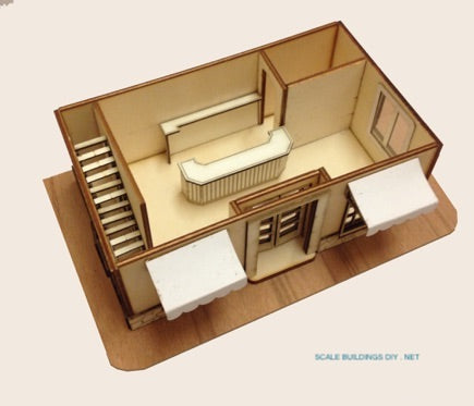 Cute proportions and pretty scolloped canopies, the 48th (quarter scale) model kit builds into a townhouse with a commercial ground floor space and a residential top floor space.