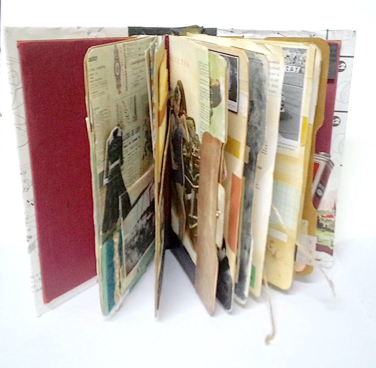 This chunky handheld journal celebrates Sportscars of the 1950s to 1960's. The cover is recycled scale car model kit, there are many true vintage book illustrations inside this book. Some pages inside are made from hand-pulled gelli printed paper and full of interesting pockets and elements, this heavily themed journal will be a vintage filled joy to carry with you. It contains pages from vintage books about the most highly anticipated WEC (World endurance championship) race known as LeMans, held annually in central France. Many of its pages are from the recycled 1970's sketchbook papers with authentic tape marks. This journal has been an absolute joy to work on and I hope you will enjoy now being the owner of this unique book on sportscar racing's golden eras!