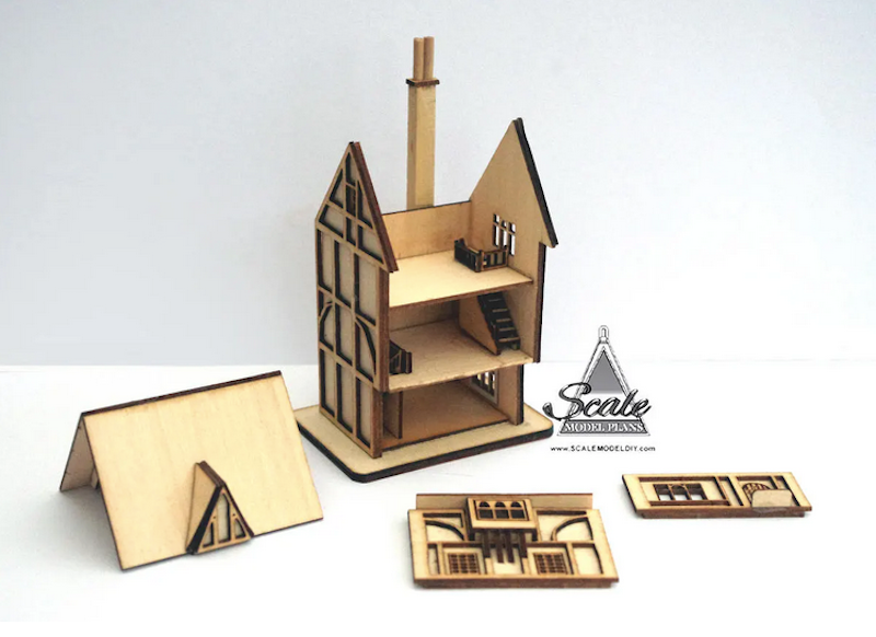 Laser cut model kit of a 144th scale medieval model building could easily represent a 16th/17th century coaching inn, ale house or a wealthy merchant’s house because of the very spacious rooms.